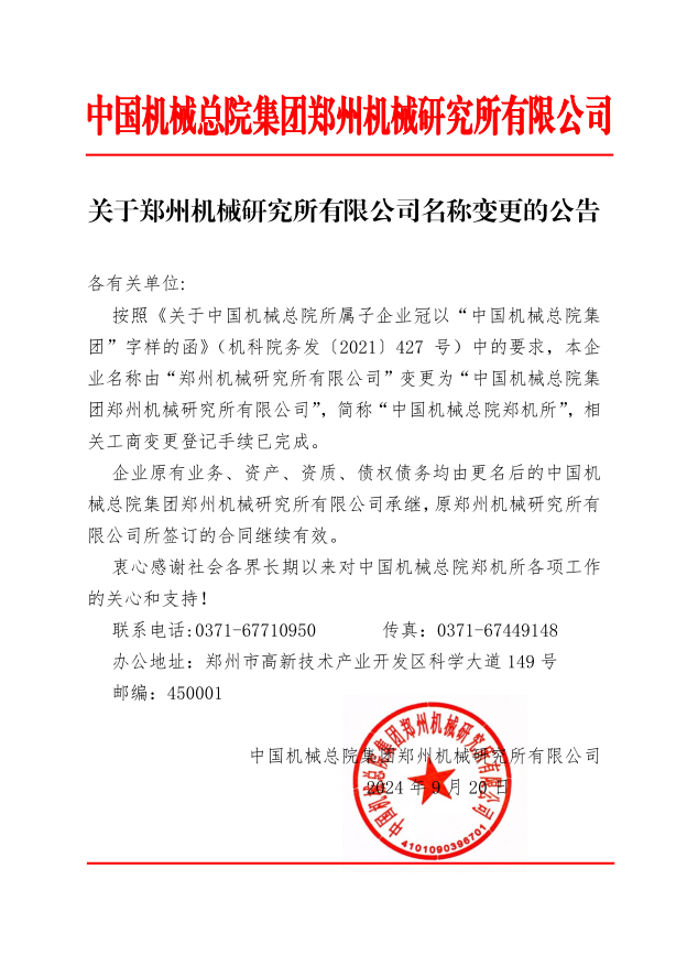 關(guān)于鄭州機械研究所有限公司名稱變更的公告
